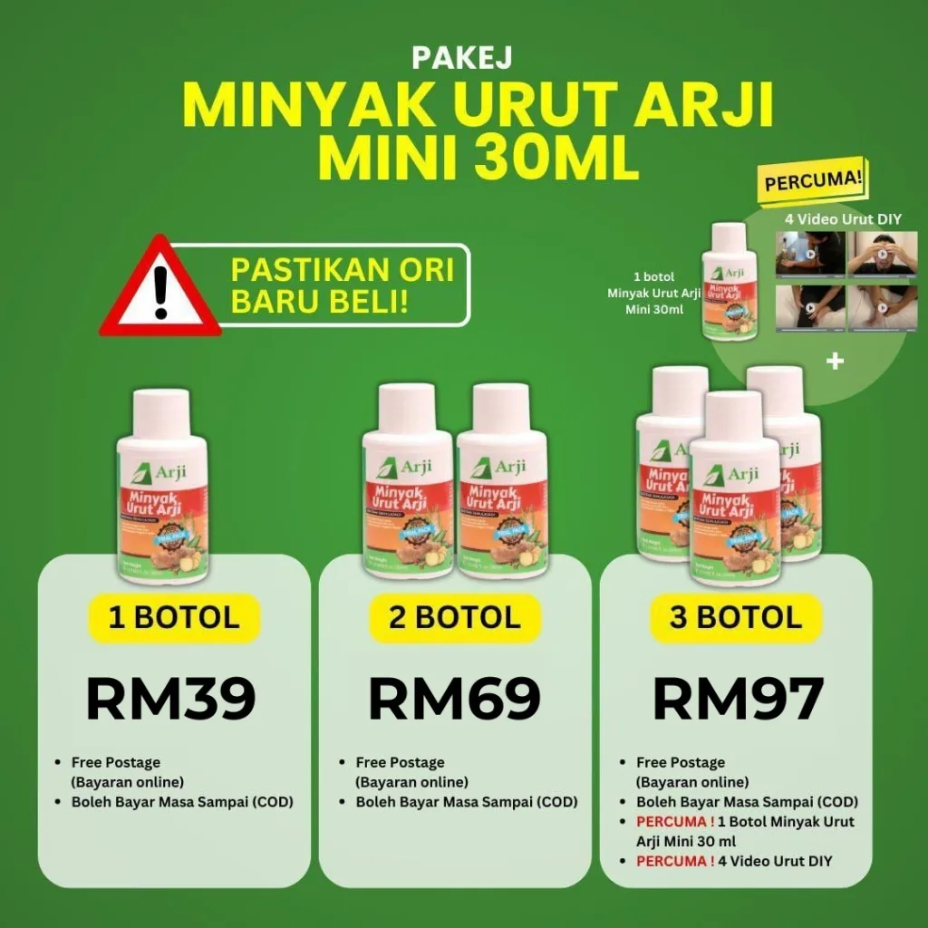 Harga Minyak Urut Arji Mini (30ml) adalah RM39 seunit. Tetapi jika anda beli banyak dapat lebih murah!